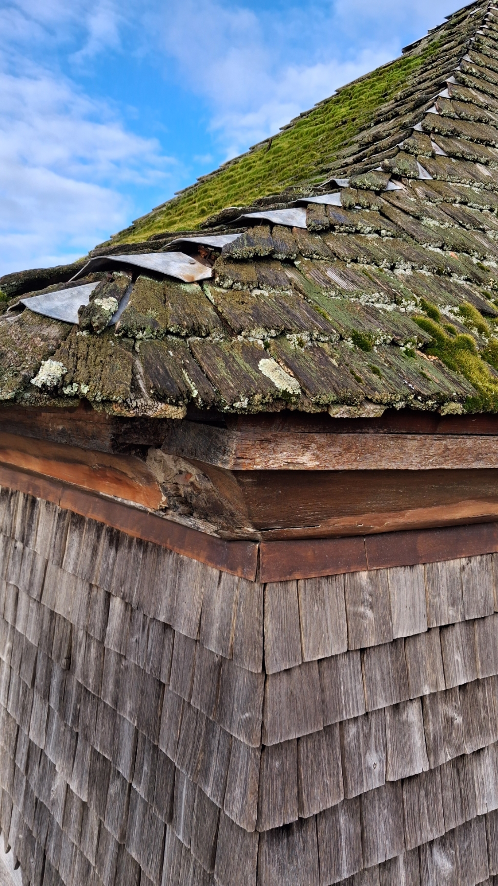 Il a été procédé à la dépose de la corniche. La pose d’une nouvelle corniche en chêne avec mouluration a été réalisée à l’identique de l’existant. Une toiture en ardoises viendra remplacer les tavaillons en bois de châtaigner très abimés par le temps. Les abat-sons et le plancher du clocher ont également été remplacés.